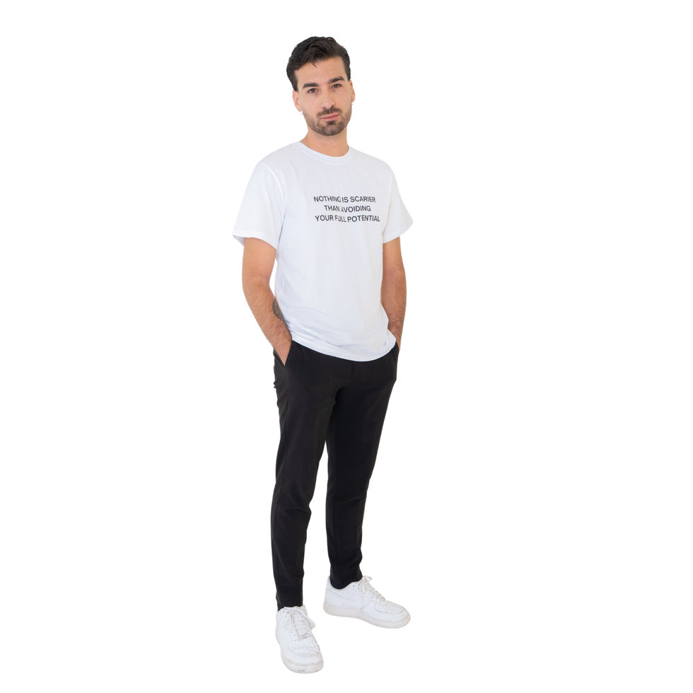 Cleanes weisses T-Shirt mit dem Statement-Print „Nothing is scarier than avoiding your full potential“. Minimalistisch, aber mit maximaler Aussage – für alle, die an sich selbst glauben.